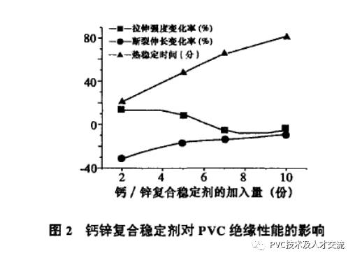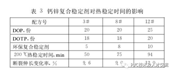 環(huán)保PVC絕緣料的穩(wěn)定劑不能含對人體有危害的鉛(Pb),鍋CCd}、汞(Hg)、砷(As)、鉻(Cr)、硒(Se)、銻(Sb)等重金屬元素,因此選用無毒的鈣鋅復合穩(wěn)定劑。鈣鋅復合穩(wěn)定劑的熱穩(wěn)定性接近或超過某些鋇/鍋穩(wěn)定劑、鉛類穩(wěn)定劑,并且耐候性好、透明性良好。鈣鋅復合穩(wěn)定劑對熱穩(wěn)定時間的影響見表3配方中填充劑25份,潤滑劑0.6份,抗氧劑0.6。鈣鋅復合穩(wěn)定劑的加入量太少材料老化性能不合格,加入量太多成本太高,一般加入5份左右比較合適。