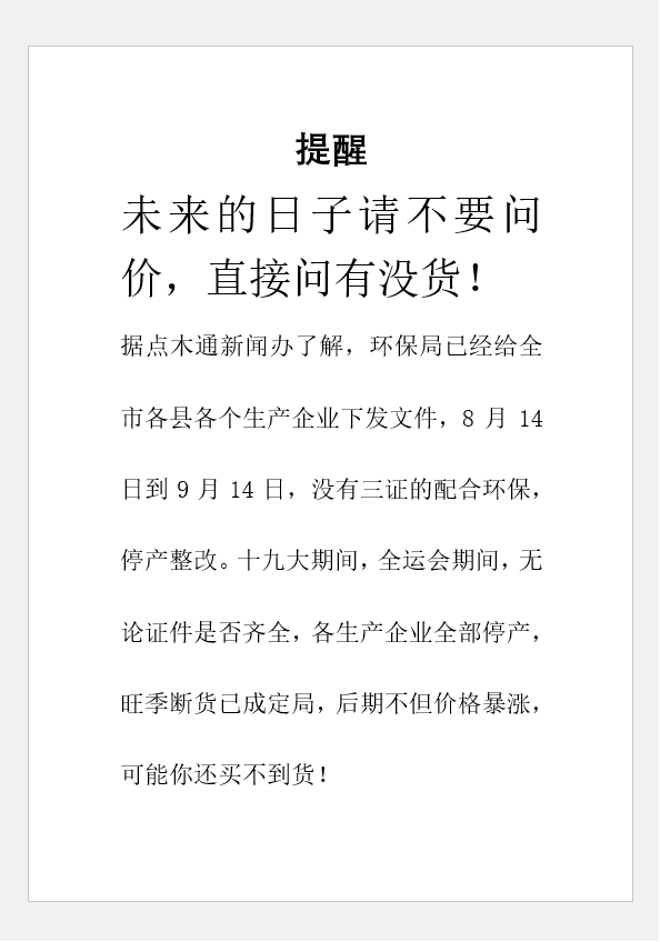 除此之外,還有今日網(wǎng)上一直瘋傳的:“未來的日子請不要問價,直接問有沒貨”的帖子在朋友圈瘋傳,都是關(guān)于材料漲價,且與環(huán)保關(guān)停、限產(chǎn)有關(guān)