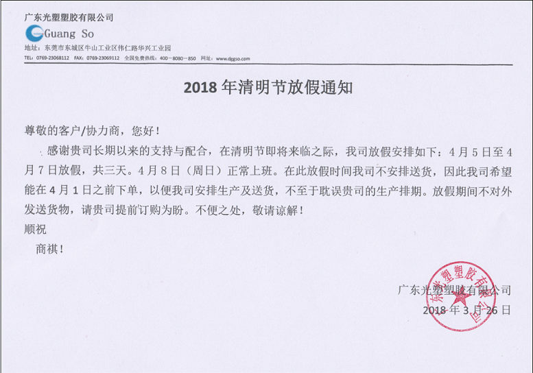 感謝貴司長期以來的支持與配合,在清明節(jié)即將來臨之際,我司放假安排如下:4月5日至4月7日放假,共三天。4月8日(周日)正常上班。在此放假時(shí)間我司不安排送貨,因此我司希望能在4月1日之前下單,以便我司安排生產(chǎn)及送貨,不至于耽誤貴司的生產(chǎn)排期。放假期間不對外發(fā)送貨物,請貴司提前訂購為盼。不便之處,敬請諒解!