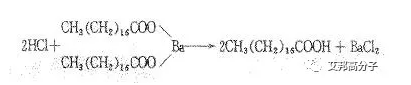 PVC在熱加工時須加百分之幾的酸吸收劑,如硬脂酸鋇、有機錫、鉛化合物等,以提高其穩(wěn)定性。以硬脂酸鋇為例,反應式如下: