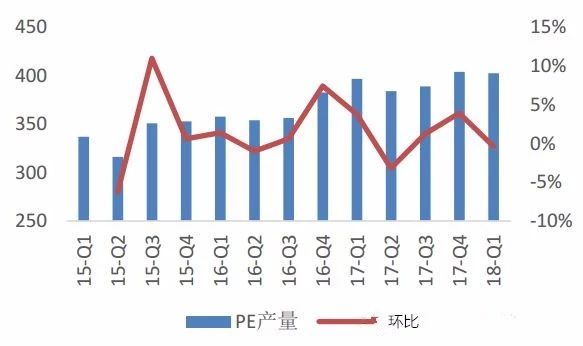 數(shù)據(jù)顯示,中國聚乙烯進口依存度在40-45%左右,進口依賴度較高。2018年1月份聚乙烯進口128.9萬噸,環(huán)比增加17%。2月份由于春節(jié)假期因素進口量下降明顯,但3月份從遠洋貨物的到港情況來看,進口量仍存較高預期。