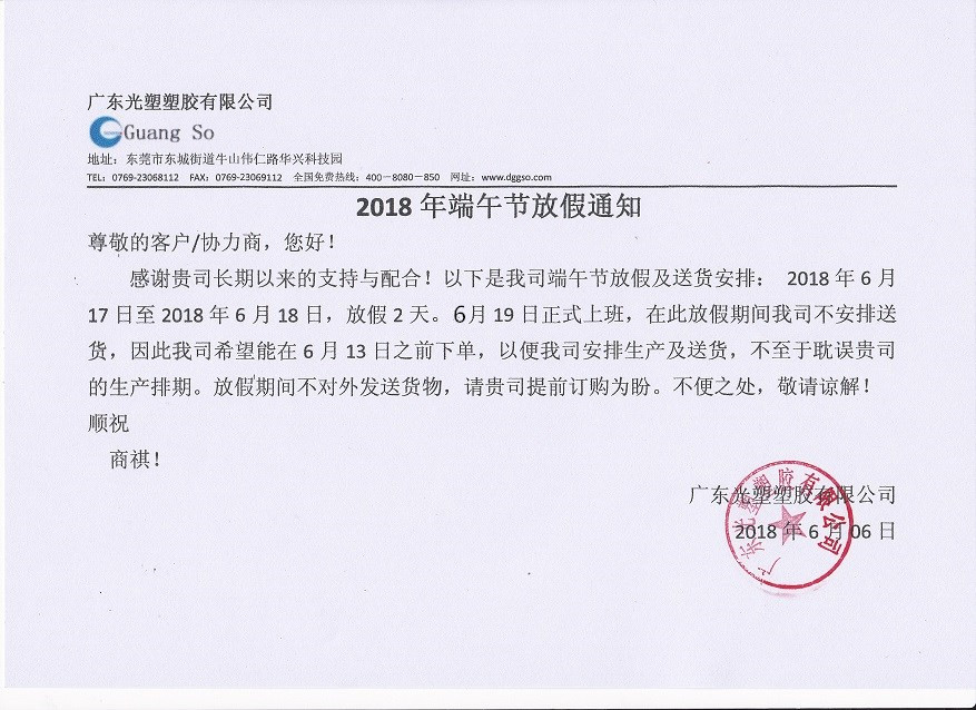 感謝貴司一直以來的支持與配合。以下是我司2018年端午節(jié)放假通知,望知悉!