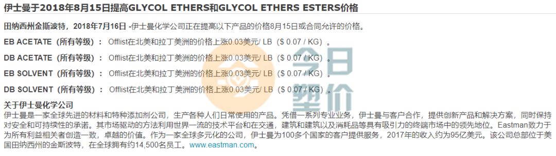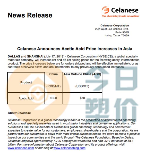 2018年7月17日,全球特種材料公司塞拉尼斯公司宣布將提高醋酸上市和售后價格。