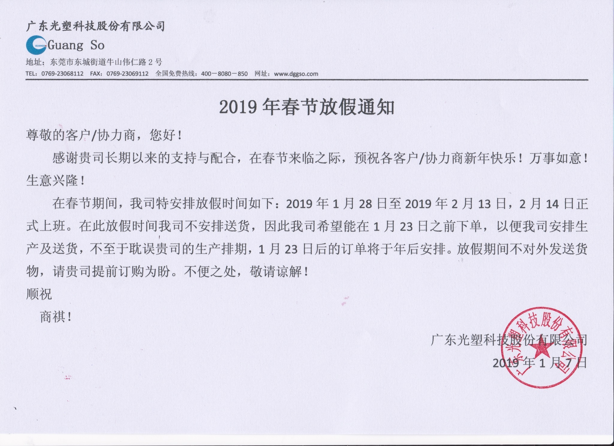 尊敬的客戶/協(xié)力商,您好!感謝貴司長期以來的支持與配合,在春節(jié)來臨之際,預(yù)祝各客戶/協(xié)力商新年快樂!萬事如意!生意興??!在春節(jié)期間,我司特安排放假時(shí)間如下:2019年1月28日至2019年2月13日,2月14日正式上班。在此放假時(shí)間我司不安排送貨,因此我司希望能在1月23日之前下單,以便我司安排生產(chǎn)及送貨,不至于耽誤貴司的生產(chǎn)排期,1月23日后的訂單將于年后安排。放假期間不對外發(fā)送貨物,請貴司提前訂購為盼。不便之處,敬請諒解!