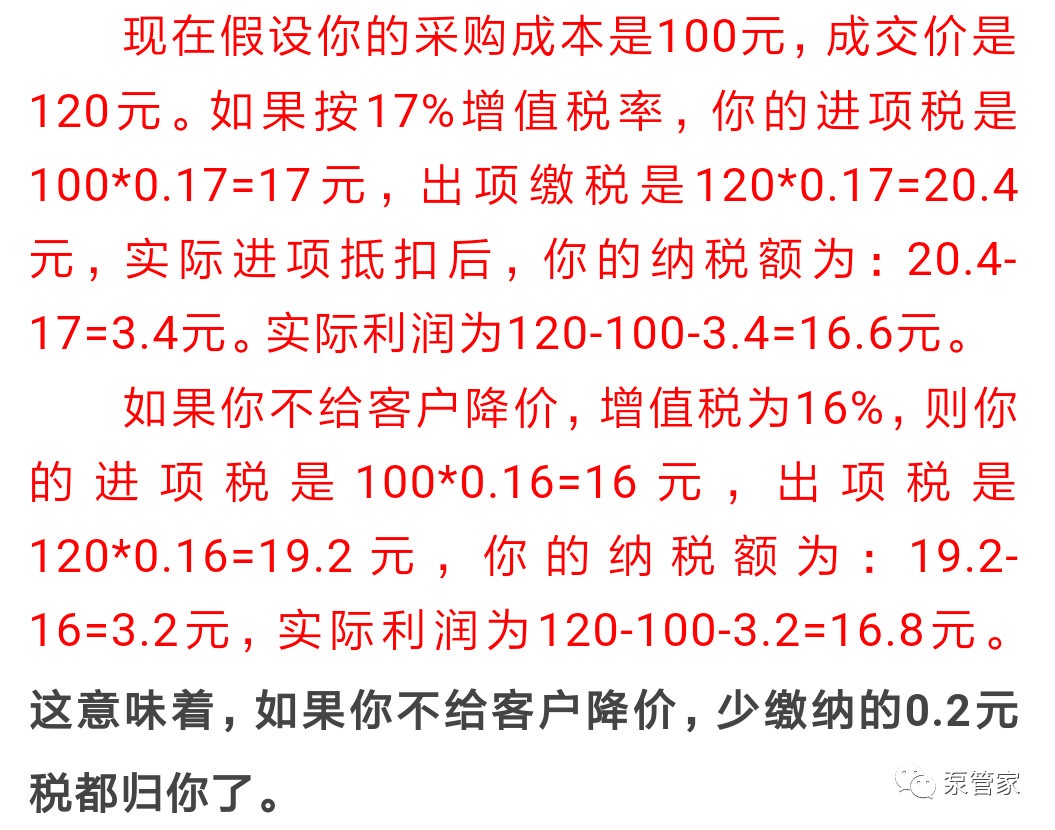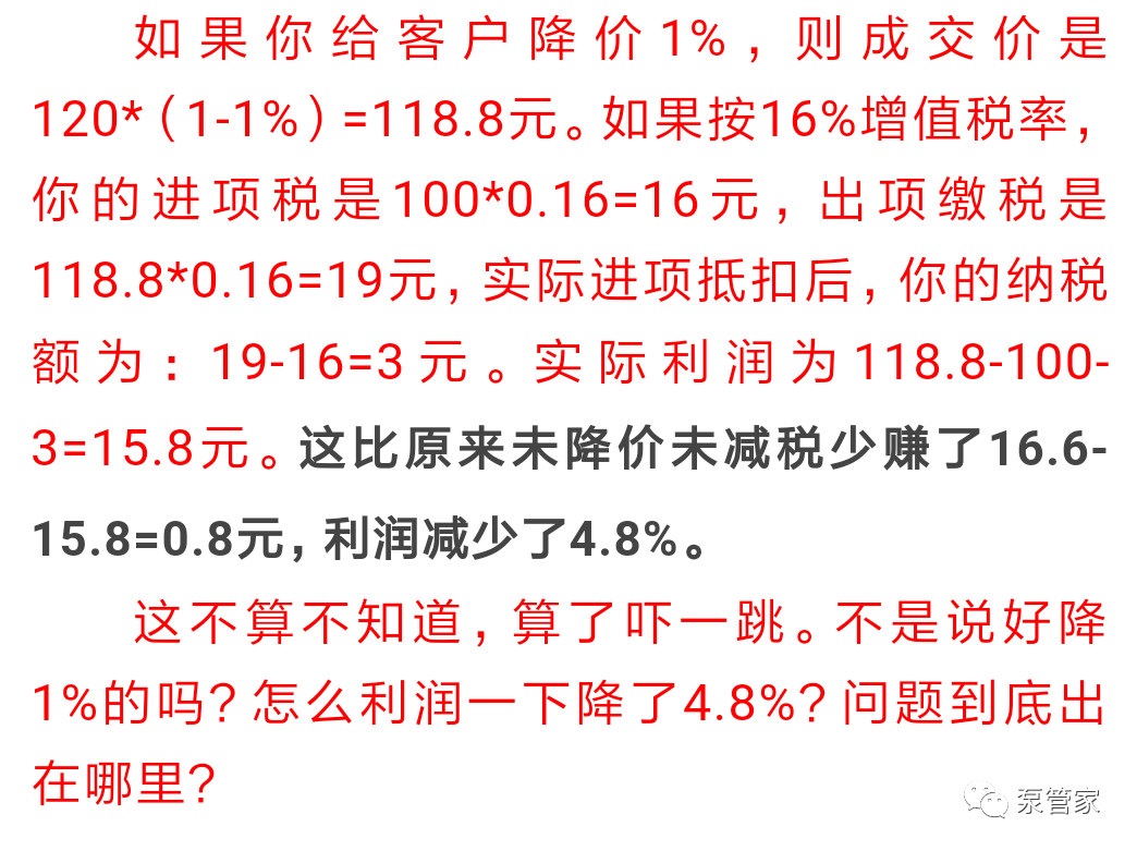 朋友們,還記得去年國(guó)家把增值稅從17%降到16%,眾多朋友反應(yīng)它們的客戶借機(jī)要求降價(jià)1%,從感覺上來說,似乎給客戶下降1%是合理的,但從直覺上又覺得簡(jiǎn)單降價(jià)1%不太對(duì)。感覺不對(duì),有點(diǎn)亂,得捋一捋。