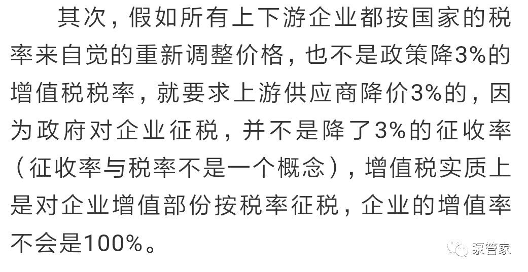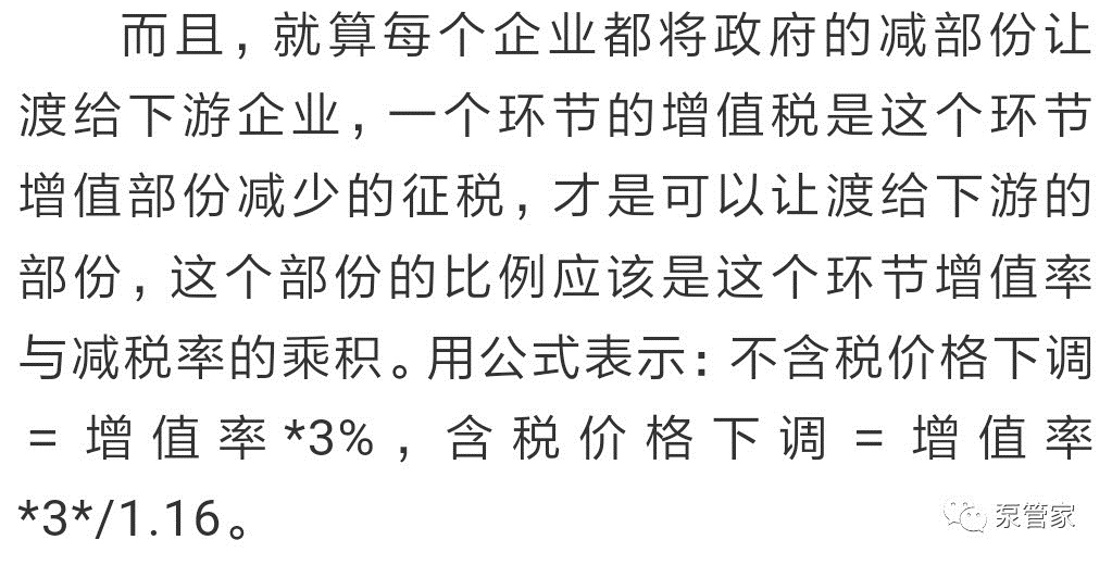 因此,從純降稅來看稅負(fù)的下降,每個(gè)企業(yè)減稅的空間,取決于該企業(yè)的增值率和上游企業(yè)的減稅轉(zhuǎn)移。實(shí)際上,上游企業(yè)也不可能是降價(jià)3%,合理的只能是將上游減稅的部份轉(zhuǎn)移到下游,正如我們分析的例子,稅率降3%,企業(yè)降價(jià)1.2%。