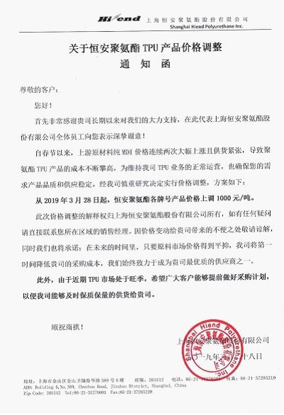 目前聚氨酯TPU等產(chǎn)品也因成本攀升,有了跟漲效應(yīng),上海恒安聚氨酯股份有限公司日前發(fā)布《通知函》稱:自春節(jié)以來,上游原材料純MDI價格連續(xù)兩次大幅上漲且供貨緊張,導(dǎo)致聚氨酯TPU產(chǎn)品的成本不斷攀高,為維持公司正常運營,也確保下游供貨穩(wěn)定,從2019年3月28日起,恒安聚氨酯各牌號產(chǎn)品價格上調(diào)1000元/噸。