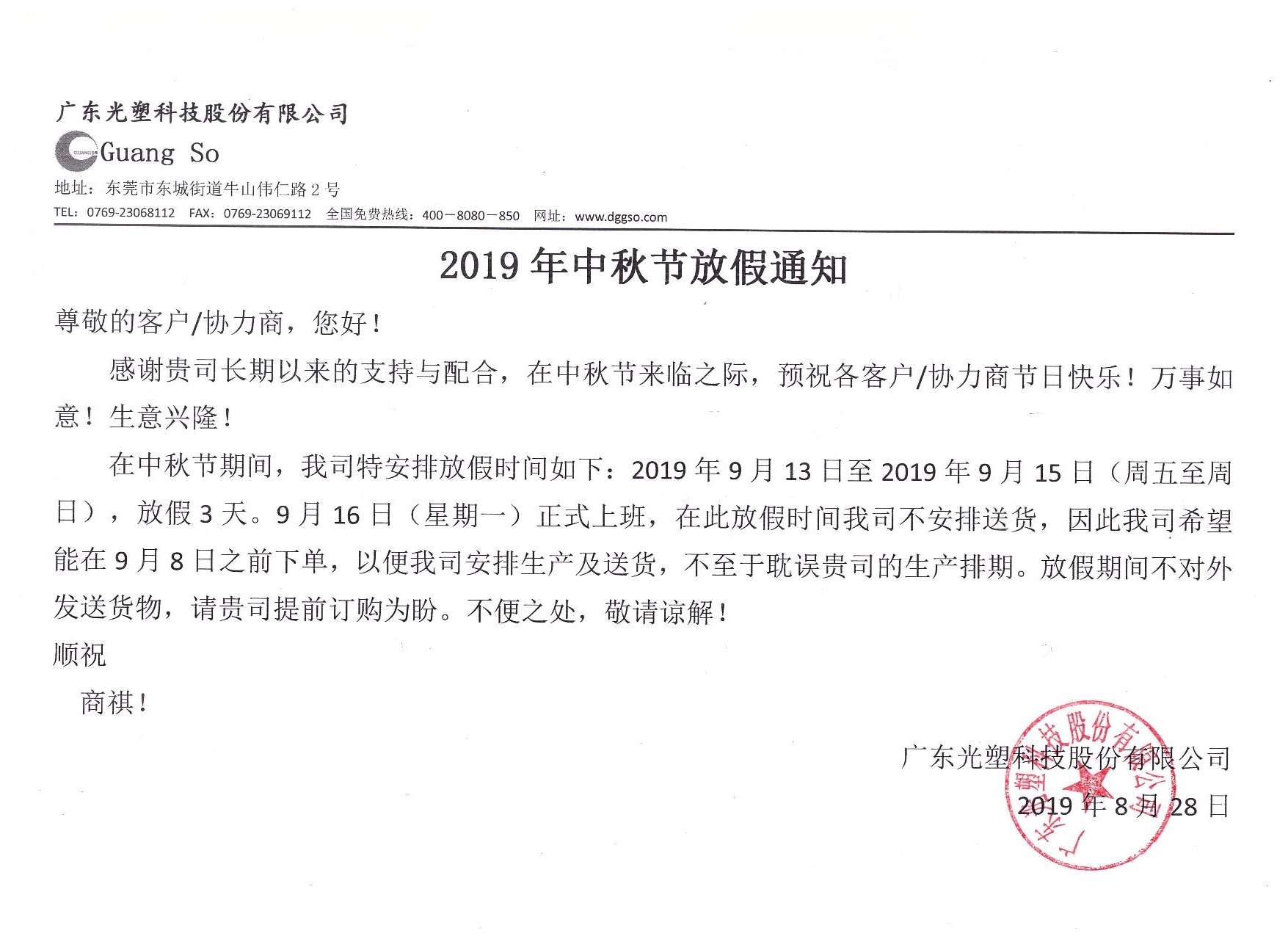 在中秋節(jié)期間,我司特安排放假時間如下:2019年9月13日至2019年9月15日(周五至周日),放假3天。9月16日(星期一)正式上班,在此放假期間我司不安排送貨,因此我司希望能在9月8日之前下單,以便我司安排生產(chǎn)及送貨,不至于耽誤貴司的生產(chǎn)排期。放假期間不對外發(fā)送貨物,請貴司提前訂購為盼。不便之處,敬請諒解!
