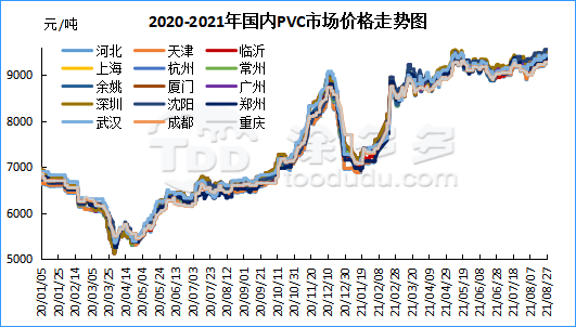 本周(2021.8.23-2021.8.27)PVC市場價(jià)格周內(nèi)現(xiàn)貨價(jià)格先漲后跌,周一到周三維持了小幅上漲為主,周四現(xiàn)貨市場價(jià)格開始出現(xiàn)分化,周五現(xiàn)貨價(jià)格出現(xiàn)下行。整體來看周內(nèi)現(xiàn)貨價(jià)格均一直維持在高位。成交方面仍舊維持清淡,下游采購積極性欠佳,過高的采購壓力使得行情雖然已經(jīng)逼近9月份,需求方面卻遲遲不見好轉(zhuǎn),淡季或?qū)⒃诟呶籔VC價(jià)格的壓制下延續(xù)。下游開工方面變化不大,制品企業(yè)多維持生產(chǎn)為主,8月23日廣東地區(qū)執(zhí)行“開五停二”的有序用電新政策。但目前需求方面對于整體來講并未凸顯出較大的影響,仍需持續(xù)觀察江蘇、廣東地區(qū)的能耗控制政策。出口方面:本周亞洲市場受供應(yīng)緊張及海運(yùn)費(fèi)上漲帶動,價(jià)格上漲30-40美元/噸,CFR中國在1310美元/噸,CFR東南亞在1320美元/噸,CFR印度在1560美元/噸。整體來看周內(nèi)市場運(yùn)行尚可,整體現(xiàn)貨價(jià)格呈現(xiàn)上漲趨勢。從估價(jià)對比來看,其中華北地區(qū)上漲70-95元/噸,華東地區(qū)上漲25-35元/噸,華南地區(qū)上漲55-125元/噸,廈門下跌25元/噸,東北地區(qū)上漲75元/噸,華中地區(qū)上漲100-125元/噸,西南地區(qū)上漲50元/噸